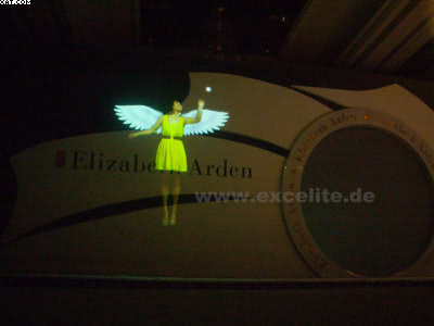 2008年7月2日,全球顶级美容品牌伊丽莎白雅顿于7月2日在上海浦东香格里拉大酒店内隆重推出旗下的全新产品----超时空金致导航精华液。伊丽莎白雅顿全球副总裁Jacques Steffens,亚太区总裁陈志新携手著名歌手叶蓓与所有来宾共同见证了超时空金致导航液的经典诞生。采用EXCELITE SH的HOLOVISION全息成像技术,真假歌手同台演出,时而在雨中漫步,时而漫步花丛,轻轻吹口气,飞出很多星星,而最新推出的产品则在空中由金色的星星幻化而来。丰富的想象,真实的体验,观众在亦真亦幻中共同惊喜见证新品的上市。